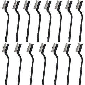 Mini roestvrijstalen draadborstelset (set van 15) - staalborstel met gebogen kunststof handgreep en ophanggat - ambachtelijke borstel voor het reinigen van metselwerk, metaalwerk