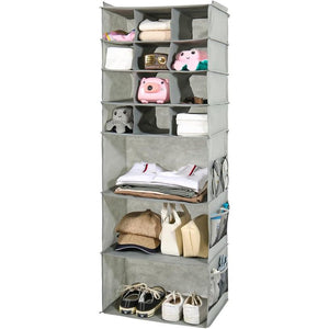 Materiaal: scheurvaste dubbellaagse vliesstof en robuuste vezelplaat met gemiddelde dichtheid, ademend en stofdicht, slijtvast en duurzaam, fijne naden. De bovenkant is bevestigd met een superharde PP-plank, 2 robuuste metalen haken, geschikt voor de meeste standaard kaststangen. Het in de bodem van elk vak geplaatste karton verhoogt de stabiliteit aanzienlijk en kan de vorm van de kledingkastorganizer goed behouden zonder te buigen. MAAT: De totale grootte van het hangrek -135 cm (hoogte) x 30 cm (lengte) x 42 cm (breedte), grote vakgrootte-27 x 42 cm; kleine vakgrootte-14 x 14 cm. Verschillende voorwerpen kunnen in vakken op verschillende gebieden worden bewaard, houd alles op orde. Het open ontwerp maakt het mogelijk om de opbergvoorwerpen gemakkelijk te zien. MULTIFUNCTIONEEL ONTWERP: de kledingkastophangtas bevat 3 extra grote vakken en 12 kleine vakken - Het kleine vak biedt ruimte voor portefeuilles, riemen, stropdassen, zijden sjaals en andere accessoires; in het grote vak kunnen schoenen, hoeden, handtassen, dikke kleding, beddengoed en andere grote voorwerpen worden bewaard.