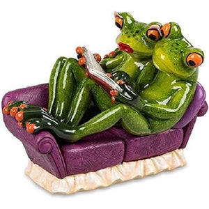 Paar kikkers op bank 15 x 11 cm gemaakt van kunststeen en met de hand beschilderd. Producttype: beeldje. Translation: Een paar kikkers op een bank van 15 x 11 cm, gemaakt van kunststeen en met de hand beschilderd. Producttype: beeldje.