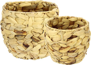 Gevlochten van echte waterhyacinten Kan als bloempot voor kunstbloemen en planten worden gebruikt. Deze rieten manden kunnen ook worden gebruikt als geschenkmand, paasmand, plantenbak, mini-kerstboommand, bloemenmand. Set van 2 Afmetingen: 14 cm hoog, 15 cm diameter en 17 cm hoogte en 19,5 cm diameter. Deze gevlochten pot past bij bloempotten met de afmetingen 12 cm hoog, 13 cm diameter en 15 cm hoogte en 18 cm diameter.