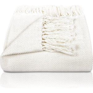 Premium sprei met franjes, 100% katoen, 220 x 240 cm, XXL, visgraatpatroon, zomerdeken, katoenen deken als bedsprei, bankdeken, bankdeken (crème)