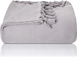 Premium sprei met handgeknoopte franjes, 100% katoen, 150 x 220 cm, wafelpiqué zomerdeken, katoenen deken als bedsprei, banksprei en bankdeken, grijs