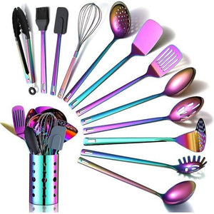 Regenboog keukengereiset, 13-delige roestvrijstalen kookgereiset met titanium regenboogcoating, keukengereiset met bestekhouder voor antiaanbakpannen (13-packs)