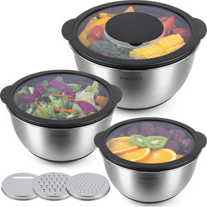 Set van 3 mengkommen – de set bevat 3-delige roestvrijstalen mengkommen (1,4 l/2,8 l en 4,7 l), waarmee gebruikers levensmiddelen in een keukengereedschap kunnen meten, mengen, gieten en serveren. Ze worden geleverd met BPA-vrije deksels, 3 raspopzetstukken, antislip siliconen bodem en meetmarkeringen. Topkwaliteit: de THLEITE 3-delige kommenset bestaat uit verdikt roestvrij staal dat geschikt is voor levensmiddelen en is daardoor smaakneutraal en duurzaam. Ze zijn van binnen spiegelglad en van buiten geborsteld, wat zowel aantrekkelijk als functioneel is. Handig toevoegen: verbeterd deksel dat nauw aansluit om een luchtdichte afdichting te garanderen en levensmiddelen vers te houden, zodat deze set als droge bewaarschaal met deksel kan worden gebruikt. Bovendien heeft het kunststof deksel van de grootste kom een afneembaar midden. Hier kan een van de 3 vrije raspen worden geplaatst als je iets moet wrijven. Eenvoudige reiniging: comfortabel te bedienen en nog eenvoudiger te reinigen. Deze schalen kunnen gemakkelijk met de hand met water en zeep of in de vaatwasser worden gereinigd. Deksel en raspen worden echter alleen met de hand gewassen, omdat ze door het gebruik van de vaatwasser worden vervormd. De schalen zijn veilig in de koelkast en vriezer en oven voorverwarmen.