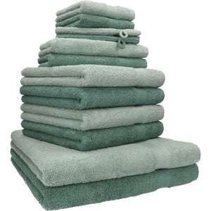 set van 12 badstoffen handdoeken, 2 x badhanddoeken, 4 x handdoeken, 2 x gastendoekjes, 2 x washandjes, kleur hoogren/dennengroen