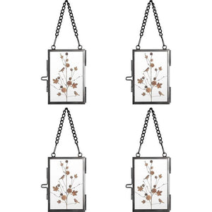 Set van 4 mini-rechthoekige fotolijsten van metaal en glas, hangende glazen fotolijst, geometrisch ornament, plantenmonsterclip, voor geperste bloemenfoto's, zwart