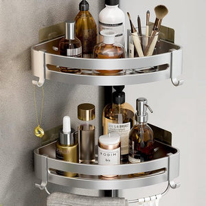Space aluminium shelf: the shower caddy corner shelf is made of space aluminium, hand-polished, anodised, rust-proof and scratch-resistant, corrosion-resistant and durable. Fits easily into existing decor thanks to the simple design. Installation: For installation, you should first thoroughly clean the wall and make sure you have selected the desired place for the shelf. Then mark a place where the hook sticker should be attached and stick the hook sticker according to the marking. Then you can easily hang the shelf. Easy to remove: If you want to position the shelf in another place, you can use the sticker with a hair dryer for approx. Heat for 30 seconds. After that, the shelf can be easily removed and hung in another place. No drilling: no drilling is required to attach the shelf. It can be easily applied to the wall with a sticker without damaging the wall. If you want to install the shelf on an uneven wall, we have also provided a hardware package for drilling. Wide range of uses: with two hooks for hanging shower balls and other items, this modern shower shelf is ideal for use in the bathroom and kitchen.