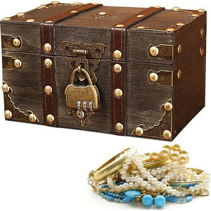 Veiligheidsontwerp: vintage houten schatkist met slot, buitenafmetingen: 18*11*10cm/7.08*4.33*3.93in, binnenafmetingen: 16.5*9.5*9cm/6.49*3.74*2.54in, voldoende ruimte voor diverse sieraden en cosmetica. Gesloten. Het ontwerp beschermt items beter tegen stof; het is ook uitgerust met een cijferslot om waardevolle spullen beter te beschermen tegen verlies; het kan gemakkelijk door kinderen worden omgegooid. Inhoud verpakking: je ontvangt 1 houten opbergschatkist; het kan worden gebruikt als opbergdoos of sieradendoos om kleinere spullen voor de dagelijkse behoeften op te bergen; het initiële wachtwoord van de houten schatkist is 000. RETRO DESIGN De houten schatkist is vervaardigd met traditioneel retro vakmanschap. De dubbele scharnieren zijn
