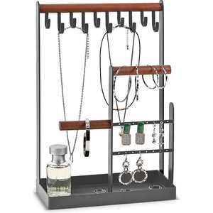 • Eenvoudig design: 10 haken voor kettingen; 16 oorbelgaten voor oorbellen; 2 houten balken kunnen ringen, armbanden en horloges organiseren; onderste dienblad kan lippenstift, mini-parfum en andere kleine voorwerpen opbergen