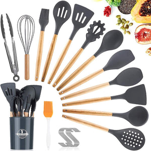 Siliconen keukengereiset, (25-delig) Keukengerei-pannenset, anti-aanbaklaag Hittebestendige siliconen spatelset, keukengerei Stukken veilig met houten handvat (grijs)