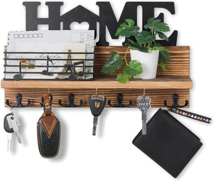 Multifunctionele organisatie: het sleutelrek kan optimaal gebruik maken van de wandruimte om sleutels, portemonnees, brieven, jassen, hondenriemen, tassen, paraplu's, planten en andere spullen op te bergen. Spullen blijven op hun plaats en zijn altijd binnen handbereik, waardoor het leven gemakkelijker wordt. Elegante wanddecoratie - Het sleutelplaatje is 38 cm lang en is verlengd voor een eleganter design. Met de verwijderbare HOME-ijzeren decoraties kan het in vele woonstijlen worden geïntegreerd en wordt het een wanddecoratie voor entrees, gangen, slaapkamers en kantoren. Materiaal van massief hout: de sleutelhouder is gemaakt van 100% massief hout, natuurlijk en milieuvriendelijk, met een lichte houtgeur. De sleutelhaak kan maximaal 10 kg dragen. Praktisch cadeau: dit houten sleutelrek in rustiek bruin en zwart is eenvoudig maar stijlvol en past bij verschillende huisstijlen. Deze sleutelhouder is een ideaal housewarmingcadeau voor vrienden en familie.