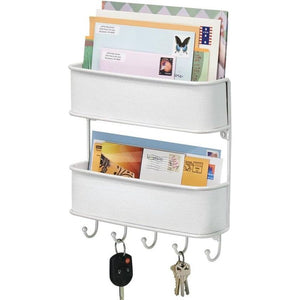 Slim opbergen: dit leuke sleutelrek biedt aan vijf haken voldoende ruimte voor uw sleutelopberging. Deze zijn ook geschikt als hoedenhaken. De constructie heeft bovendien twee compartimenten die perfect geschikt zijn als postplank. Modern design: elegant metaal gecombineerd met witte accenten van kunststof gaas. In deze moderne look verwelkomt deze sleutelorganizer de gasten bij de entree met een optisch hoogtepunt. Veelzijdig plankje: Uiteraard is dit sleutelrek niet alleen geschikt voor sleutels en post. Je kunt ook paraplu's, hoeden, sieraden of zelfs boeken opbergen en ordenen. Robuust en duurzaam: dankzij het gebruik van hoogwaardige materialen, zoals duurzaam metaal en kunststof gaas, zorgen wij ervoor dat je lang plezier hebt van dit uitstekende sleutelrek. Eenvoudig te installeren: met het meegeleverde bevestigingsmateriaal is de sleutelhouder in een handomdraai aan de muur gemonteerd. Dankzij de compacte afmetingen van 26,7 cm x 6,4 cm x 26,7 cm heb je voor de montage geen speciale beugels nodig.