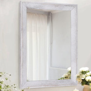 Spiegel voor aan de muur, gemaakt van rustiek hout en ingelijst. Deze decoratieve spiegel is perfect voor een boerderijstijl slaapkamer of badkamer. Hang de spiegel aan de muur voor een witte rechthoekige muurdecoratie.