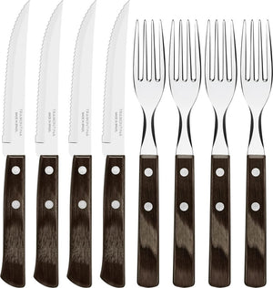 8-delige set bestaande uit 4 steakmessen en 4 x steakvorken Ook perfect geschikt als pizzabestek Materiaal: roestvrij staal AISI 420 Handgrepen van FSC-gecertificeerd echt hout Vaatwasmachinebestendig De handgrepen van echt hout zijn extreem resistent, temperatuurbestendig en schokbestendig