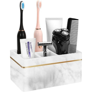 Hoogwaardig materiaal: de tandenborstelhouder bestaat uit hars- en zandsteenmaterialen en is duurzaam. Handgemaakte producten, zodat het marmerpatroon op het oppervlak anders is, wat uniek is. Gemakkelijk te reinigen, je hoeft het alleen maar af te vegen met een schone, vochtige doek. 5 steekplaatsen; deze eenvoudige en elegante tandenborstelhouder beschikt over 4 vakken voor het opbergen van tandenborstels en een groot vak voor het opbergen van tandpasta of scheerapparaat, lotion, gezichtsreiniger, kam, wenkbrauwsnijder en andere accessoires. Het is zeer geschikt voor gezinnen en slaapzalen van 4 personen. Met drainagegaten – aan de onderkant bevindt zich een afneembare aftapplug, die het water na het openen automatisch kan afvoeren en de ventilatie vergemakkelijkt om de tandenborstelhouder en de artikelen droog en netjes te houden. Het product is zwaarder, zodat het niet gemakkelijk omvalt of valt. Mooi en elegant: deze houder heeft een unieke marmeren structuur, gladde randen en een gouden lijndecoratie, een eenvoudige uitstraling en een avant-garde design. Gebruik het om je tandenborstels, tandpasta en andere voorwerpen te organiseren en je badkamer een decoratie te geven. Breed toepassingsgebied: de tandenborstelhouder is zeer geschikt voor slaapzalen, gezinnen, hotels en andere gelegenheden. Je kunt hem op het aanrecht, de kaptafel, de badkamer en andere plaatsen plaatsen. Het kan niet alleen worden gebruikt voor het opbergen van tandenborstels, tandpasta of andere badkameraccessoires, maar ook voor het opbergen van make-upborstels, kammen, haaraccessoires enz. Het is zeer praktisch.