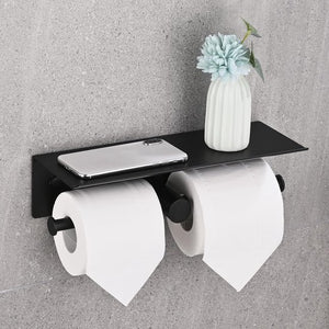 Toiletpapierhouder zonder boren, wc-rolhouder met plank, zelfklevend, wandmontage, aluminium, dubbele wc-rolhouder, wc-papierhouder, voor badkamer, 31 cm, zwart