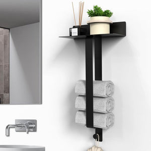 Materials & Size & Weight: towel holder self-adhesive is made of stainless steel thickening, high-quality material can effectively prevent scratches and is not easy to rust and corrode. Size: 42cm*4cm*6.5cm. Shelf size: 25 cm x 10 cm x 4.5 cm. Weight: approx. 800 g. Can hold up to 7 kg. Towel rail without drilling: very easy to install. Simply peel off the protective film from the double-sided tape and press the towel holder bathroom for a few seconds on a smooth, clean surface. The back has a strong adhesive and is very stable. No drilling is required and the surface is not damaged. Please wait 24 hours before hanging the towel. Unique design: our wall towel holder has been carefully extended and recessed. The matte black design effectively solves the problem of fingerprints, dust and oil accumulation. Heart warming hook design for hanging bath bombs or brushes. 【Application】: With a towel holder, you can save a lot of space in the bathroom, toilet, hotel, kitchen, etc. It can store multiple towels - you can roll them up and put them in or hang directly on the hook of the towel holder, aromatherapy can be placed on the shelf. Please use it only on smooth surfaces, do not stick to painted walls, wallpaper, plaster wallls or other uneven surfaces.