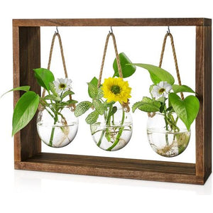 Uitstekende meerderheid: met vintage houten frame en 3 grote glazen vazen met een nieuw luchtterrarium-hangdesign. In tegenstelling tot geperforeerde vazen met nauwe openingen kan het altijd worden verplaatst voor eenvoudige waterverversing en reiniging. Geschikt voor de teelt van meerstammige en meerwortelige hydrocultuur plantenstekken, vetplanten, kunstplanten, enz. 【Eenvoudig en elegant design】De transparante hydrocultuur vaas kan de groei van de plantenwortels gemakkelijk observeren. Leg er wat kiezelstenen en zand in, het zal mooier en opvallender zijn. Je kunt ook kleine bloempotten, bloemsprays of andere decoratieve ornamenten op het houten frame plaatsen om ruimte te besparen en stijl toe te voegen. Afmetingen: de plantenkweekstandaard bestaat uit een natuurlijk houten frame en 3 dikke vazen van borosilicaatglas. Houten plantenstanda