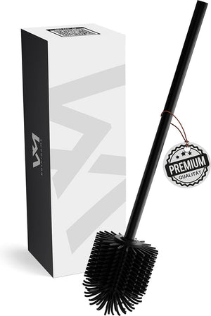 Premium kwaliteit door het product: onze toiletborstelsteel, nu in elegant, mat zwart, is van de hoogste kwaliteit. Hij biedt een buitengewone duurzaamheid en behoudt altijd zijn eersteklas look. De siliconen borstelharen zijn uiterst robuust en vormvast - een garantie voor een effectieve reiniging. Comfortabel en effectieve reiniging: de comfortabel vormgegeven handgreep ligt precies in je handen en garandeert een eenvoudige bediening. De borstelkop in elegant zwart beschikt over een anti-aanbakoppervlak, dat helpt bij elke spoelbeurt om vuil en resten te verwijderen - voor een moeiteloos en stralend schoon resultaat. Eenvoudig te reinigen dankzij het doordachte ontwerp van onze afschroefbare borstel is het wisselen snel en probleemloos uitvoerbaar. De speciale siliconen borstelharen voorkomen lelijke resten en zorgen voor minder spatten en druppels. Het resultaat is comfortabel gebruik en een schone badkamer. Het hoogste hydraterend effect: de zwarte siliconen borstelharen van de borstel beschikken over een lotuseffect, dat voor de hoogste hygiëne zorgt. Bacteriën en vuilresten hebben nauwelijks een kans om aan het gladde oppervlak te hechten - voor een hygiënisch en veilig gevoel.