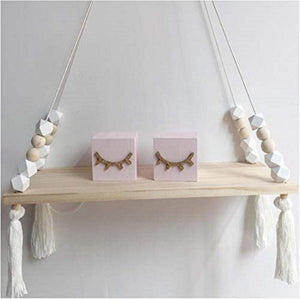 Wandrek voor kinderkamer, kwasten met houten kralen, hangrek voor kinderkamer, zwevend rek, hout, gebruikt voor opslag van kamer, slaapkamer, woonkamer, kinderkamer, wit
