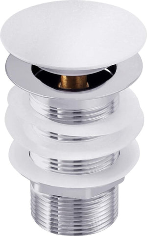 Hoogwaardig, massief afvoerventiel van messing verschromd zonder overloop Standaard DIN-aansluiting 11/4 inch past op wastafel zonder overloop. Modern design, openen en sluiten door aan te tikken. Robuust, onderhoudsarm, tijdloos design voor elke badkamer en wellnessruimte. Hoogwaardige witte poedercoating decker en ring met chroom oppervlak