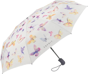 Paraplu voor dames van het merk Esprit, type zakparaplu met automatische opening. Hou je van modieuze elegantie gecombineerd met merkkwaliteit? Dan is deze zakparaplu van ESPRIT zeker goed voor jou. Het stevige, maar toch lichte frame heeft een comfortabel open-dicht-automatisch en een aangenaam groot dak, dat je betrouwbaar tegen regen beschermt. De kleur van het parapludak is automatisch open- en sluitend, het gebruikte materiaal bestaat uit 100% polyester. Klein en licht weegt de paraplu slechts 365 gram. Geopend is het scherm 95 cm groot. Gesloten meet de paraplu 29 cm. De ESPRIT Mini damesparaplu is voorzien van een speels patroon van talrijke kleurrijke vlinders en past zich consequent aan modieuze trends aan.