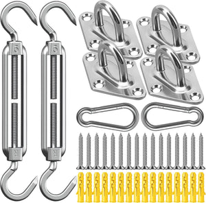 Hoogwaardig M6 zonnezeil bevestigingsset onze bevestigingsset bestaat uit hoogwaardig roestvrij staal 304, dat voor duurzaamheid en betrouwbaarheid zorgt. Met een draagvermogen van 80 kg biedt deze set een solide en veilige bevestigingsoplossing voor je zonnezeil. Veelzijdige accessoires: de set bevat 2 x karabijnhaken, 2 x klimgespen, 4 x wandhouders, 16 x schroeven en 16 x kunststof verlengingen. Deze uitgebreide keuze aan accessoires maakt een flexibele en eenvoudige installatie van je zonnezeil op verschillende oppervlakken en structuren mogelijk.
