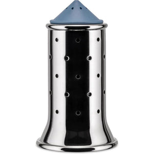 Zoutstrooier In 18/10 roestvrij staal met bodem en deksel in blauw PA Afmetingen: 7 cm x 7 cm x 14 cm